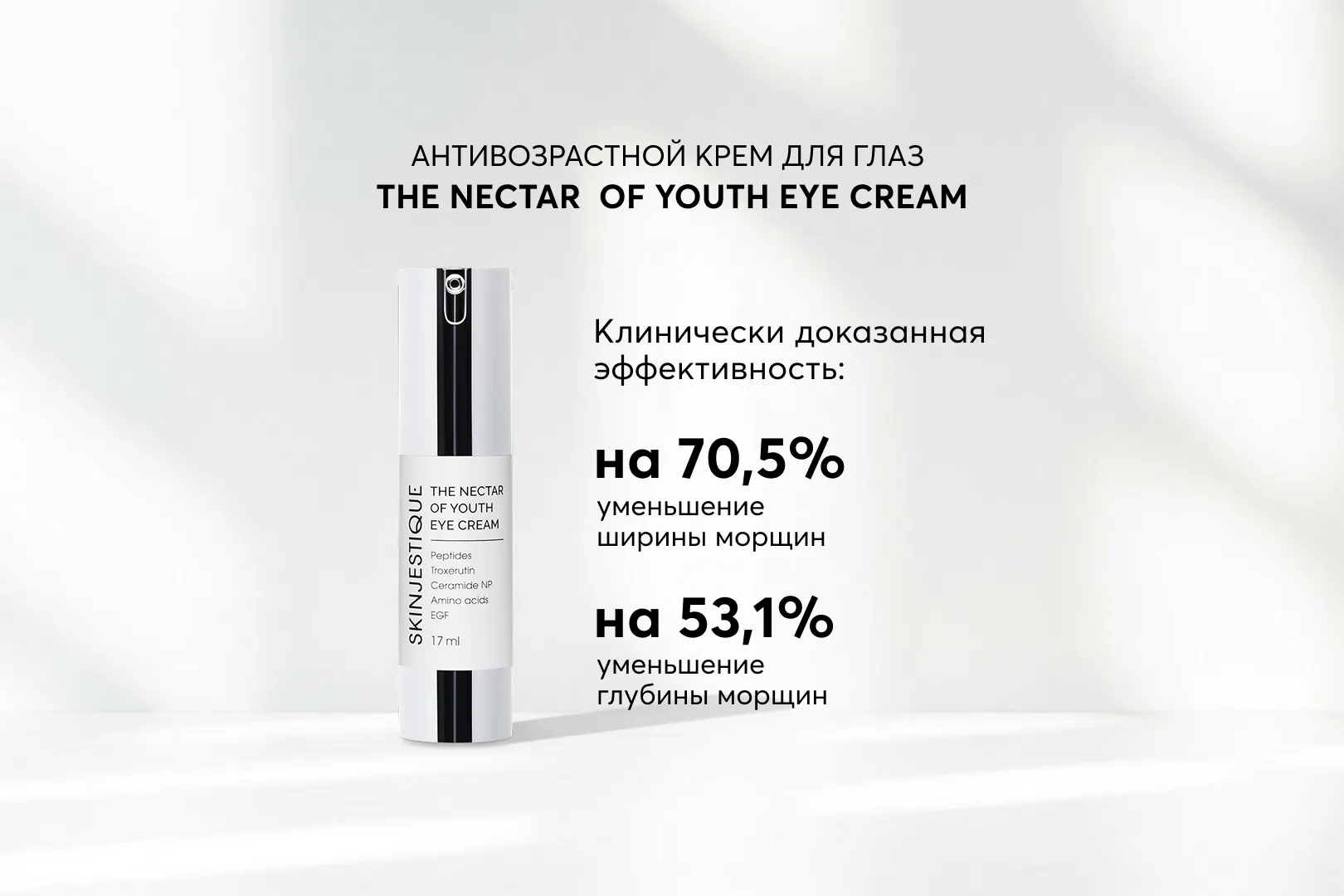 The Nectar of Youth Eye Cream в течение двух месяцев уменьшает ширину морщин на 70%, а глубину — на 53%, что доказано клинически!